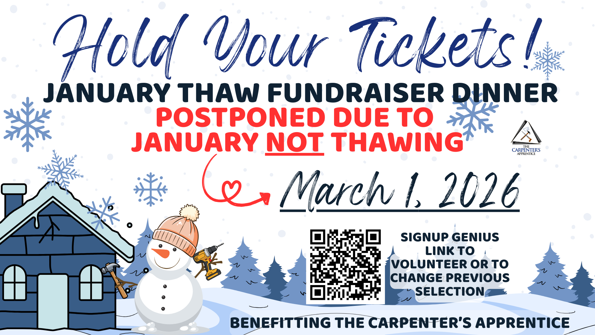 The NEW DATE for the Thaw is now MARCH 1, 2026. If you volunteered to help at the event, please check your calendars to make sure that date works for you. If you need to change your signup selection, you can do so through the SignUp Genius link below.
