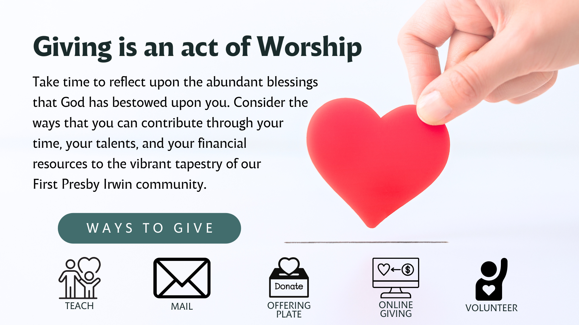 As First Presby Irwin enters the year of Stewardship, each member should reflect upon the abundant blessings that God has bestowed upon us. Consider the ways that you can contribute through your time, your talents, and your financial resources to the vibrant tapestry of our First Presby Irwin community.